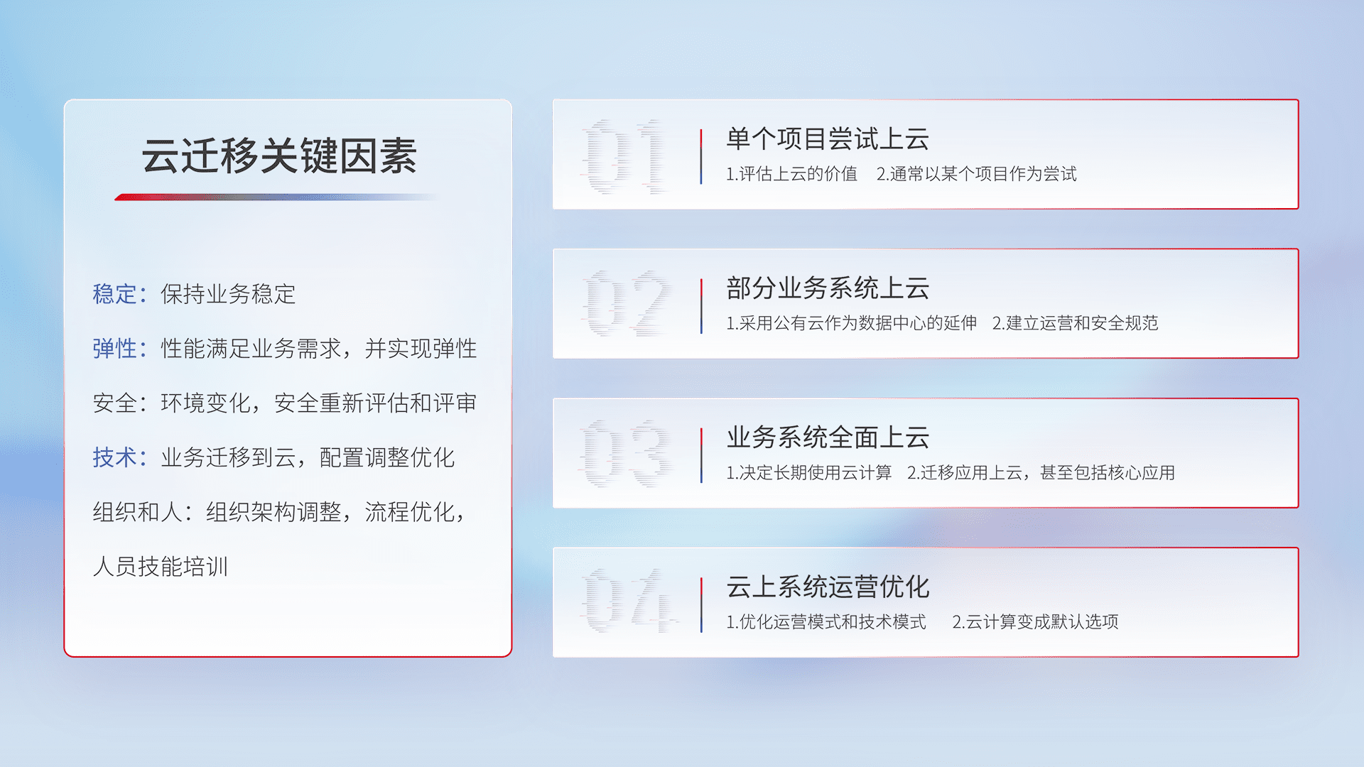 结合实际业务,,从规划设计、、云平台选型、、、、云原生改造、、、、数据迁移、、集成交付,,,迁移全过程为客户识别最佳上云路径,,,,做好风险识别管理,,设计网络架构、、、、身份权限、、安全审计合规、、、、操作审计、、、日志审计、、、监控告警策略、、多站点容灾设计等,,,,对云上基础设施进行整体规划,,提升IT治理水平,,,,以满足弹性、、、高可用、、、、高性能的需求。。
