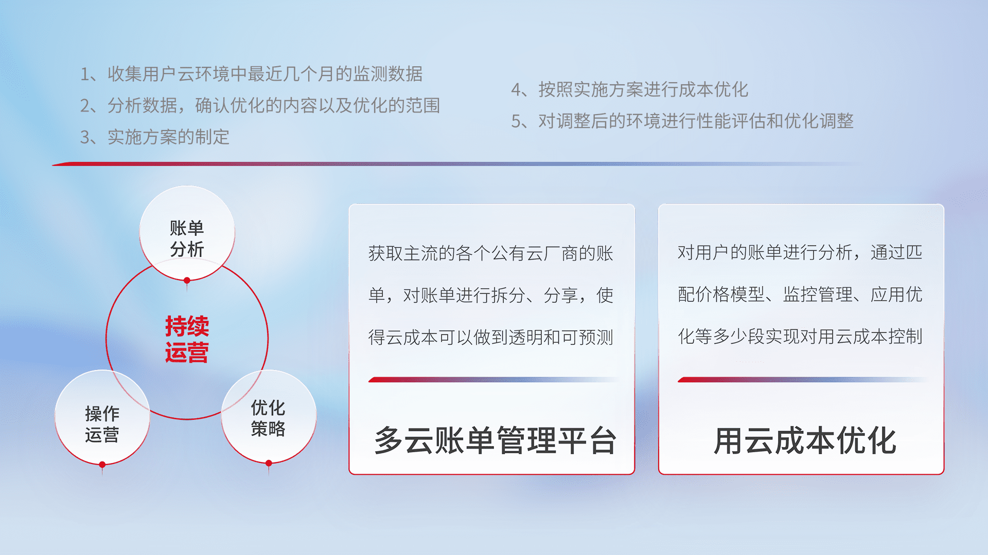 通过多云纳管,,以统一的资源数据模型把客户的云资源进行抽象和封装,,,,进而实现对多云资源的统一操作,,,,保障云资源管理的可靠性、、稳定性与可用性。。。量身定制化运维内容,,配置、、、、开发运维、、补丁管理、、备份、、、、监控、、认证和访问管理、、、、审计和日常巡检等,,保障在用云过程中的可靠度,,,稳定度以及高可用率。。